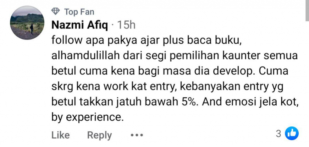 Study semua trading setups yang saya ajar dan semua cases study yang saya tunjuk. Saya tunjuk detail macamana saya pilih entry and exits dalam tu. Then do your own study and compare. Dengan cara nie you akan jadi 10x kali ganda lebih expert dalam baca charts.