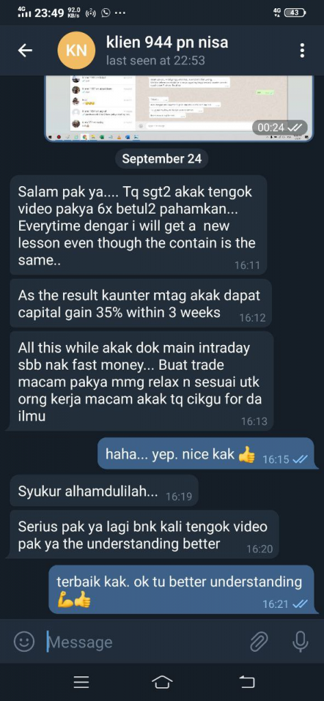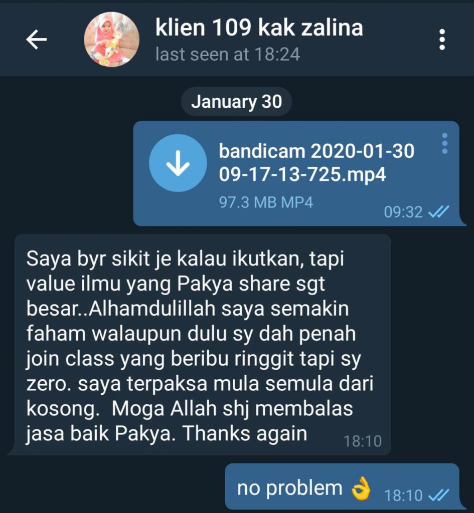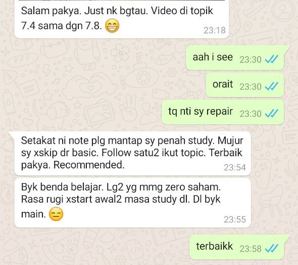 Learn at your own time, bila free study. Boleh ulang beribu kali jika tak faham, boleh tanya soalan dalam group telegram atau boleh direct whatsapp dengan Pakya terus untuk tanya soalan.